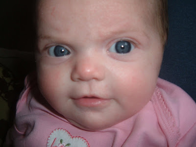 I feel like I blinked and this last month was gone!! You have been so much fun lately!! You make Daddy and Mommy laugh so hard everyday. Your faces and sounds that you make now are the cutest thing ever. You have found a new love...ceiling fans! Your favorite thing to do now is to lay on the couch, listen to daddy play guitar, and watch the ceiling fan go. You just smile at it, kick your legs, and talk to it with all that you've got! You are so close to rolling over. You get about halfway there all by yourself. Any day now and we will be chasing everywhere! You have your stash of toys in the living room corner and you have already decided which ones are your favorite. You are definitely a little girl who knows what she wants. I love that about you! We fall in love with you more everyday.